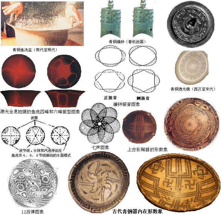 彩陶上的圖象和圖形,展現(xiàn)了上古文明的陳跡,是上文明的結(jié)晶,古埃及是幾何圖形見長,中國上古除了簡單幾何圖形,更多是形數(shù)象。五千年前,文字的發(fā)明,同時青銅器開始出現(xiàn)。中國中古夏代是由陶器向青銅器過渡的時期,殷商能鑄造精美的金器和青銅器。金屬所制的器物比粘土燒制的陶器更具活力,振動聲播、熱導電傳,比陶器優(yōu)越得多,好比近代的機械的熱動性、近現(xiàn)代電氣的電動性,現(xiàn)代電子的信息性,技術(shù)不斷更新。中古的青銅器治金和鑄造技術(shù),沒有現(xiàn)代技術(shù)先進,但青銅器一此特殊功能,卻令現(xiàn)代人嘆為觀止,難以模仿。青銅器關(guān)鍵是內(nèi)在的器構(gòu),不是外部形體結(jié)構(gòu)。商代為青銅器發(fā)展的頂盛時期,其鑄造技術(shù)一直延續(xù)至明代的近代機械鐵器鑄造興起才失傳。要問中國古代科技成就,眾人熟知的活字印刷、造紙、火藥、指南針的四大發(fā)明,這些都是小科技。中國古代高端科技是供人玩樂的中華青銅三大寶,魚洗盆、編鐘、透光鏡,其深藏科學的大道理。如圖〖古代青銅器內(nèi)在形數(shù)象〗所示,經(jīng)激光全息拍攝,青銅器內(nèi)在振動圖象,正是上古彩陶上的形數(shù)象,摩擦叩擊,洪鐘音樂,透光鏡正面采光,背現(xiàn)影像。中華青銅三大寶展示了中國古代科技工藝,采用了高超的系統(tǒng)數(shù)理,八卦符只是系統(tǒng)工具,形數(shù)象才是系統(tǒng)數(shù)理核心。