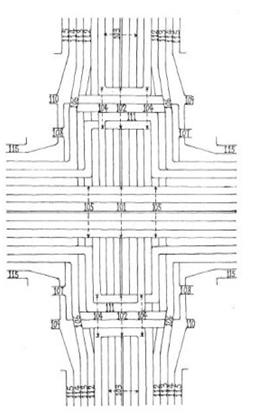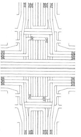 開(kāi)放型人行道115進(jìn)入路口前讓位于電動(dòng)車(chē)道。縱向電動(dòng)車(chē)道301人行道302位于兩端路面橋上的橫向掉頭車(chē)道與縱向高架車(chē)道的中間,兩端分別穿越右轉(zhuǎn)彎車(chē)道(高度以電動(dòng)車(chē)行人順利通過(guò)為宜)。人行道出入口107、108跨越電動(dòng)車(chē)道,人行道出入口107-108之間(橫向)為地下通道穿越各縱向車(chē)道(高度以電動(dòng)車(chē)行人順利通過(guò)為宜)。電動(dòng)車(chē)道出入口109-110之間(橫向)為地下通道,穿越人行道入口107、108和各縱向車(chē)道(高度以電動(dòng)車(chē)行人順利通過(guò)為宜)。