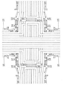 左轉(zhuǎn)彎車(chē)道的三層立交設(shè)計(jì),兩橫向左轉(zhuǎn)彎車(chē)道202分別通過(guò)兩縱向路面橋?qū)崿F(xiàn)無(wú)交叉左轉(zhuǎn),橫向左轉(zhuǎn)彎車(chē)道分別穿越縱向路面橋上的縱向左轉(zhuǎn)彎高架車(chē)道。兩縱向左轉(zhuǎn)彎車(chē)道分別通過(guò)兩縱向路面橋上的高架車(chē)道實(shí)現(xiàn)無(wú)交叉左轉(zhuǎn)。右轉(zhuǎn)彎車(chē)道為高架,跨越縱向路面橋上的縱向電動(dòng)車(chē)道人行道。各調(diào)頭車(chē)道進(jìn)出路口均為水平方向,車(chē)輛在同一平面行駛,左轉(zhuǎn)調(diào)頭,橫向調(diào)頭車(chē)道進(jìn)入路口至縱向路面橋左轉(zhuǎn)調(diào)頭,縱向調(diào)頭車(chē)道跨越橫向電動(dòng)車(chē)道人行道左轉(zhuǎn)調(diào)頭,中間穿越縱向高架橋。