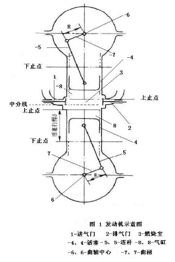 本發(fā)明的目的是這樣實(shí)現(xiàn)的:下面以一室二缸二活塞為例:它有一個燃燒室二組活塞、氣缸組成。工作原理為:以四沖程往復(fù)二活塞式內(nèi)燃機(jī)為例,四沖程往復(fù)活塞式內(nèi)燃機(jī)在四個活塞行程內(nèi)完成進(jìn)氣、壓縮、作功和排氣等四個過程,即在一個活塞行程內(nèi)只進(jìn)行一個過程。因此,活塞行程可分別用四個過程命名。
