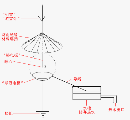 如圖7,可以在“雷擊村”,或其他發(fā)生“閃電”較多的區(qū)域,并且遠(yuǎn)離居民區(qū)的地方,放置一些大大小小的“棒電極——球冠電極”。“棒電極”樹(shù)立于空中,用于招引閃電,類似于“避雷針”,但必須與其接地的支撐物絕緣,并且深入到“球冠電極”球心的頂端部位,越細(xì)越好——越細(xì)激發(fā)的“球狀閃電”的能量越大。“球冠電極”的頂端接地,在其邊沿接一導(dǎo)線引入水槽,在閃電放電時(shí),產(chǎn)生的“球狀閃電”可以沿導(dǎo)線進(jìn)入水槽,“球狀閃電”所含的部分能量——熱能可以加熱水,這樣“閃電”的能量,就可以通過(guò)“接轉(zhuǎn)”為“球狀閃電”,再把可以“暫時(shí)儲(chǔ)存能量”的“球狀閃電”的部分能量——熱能傳給水,人們就可以利用熱水用于工業(yè)生產(chǎn)或日常生活了。