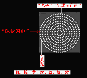 “棒電極”在球心對“球冠電極”“超短時間內的高能”(超高壓)充電、放電,可以產生“球狀閃電”,其機理為:“雙向激擊”、“球冠振蕩”。若地面為“球冠電極”,則表現為“滾地雷”“火球”,若空中云為“球冠電極”,則表現為空中“光球”。因為“球冠振蕩”的頻率的不同,“球狀閃電”內部呈現“嵌套球狀”,由外向里頻率由小到大,在可見光波段由外向里顯現為紅、橙、黃、綠、藍、靛、紫,而由外向里看,因疊加合成呈現白色,但是,當最外面的頻率較小時,也可能是黃色或綠色或藍色的;一個大“光球”,可以分離為兩個或幾個小“光球”,但其顏色將會“變深”(如圖6、7)。 [6]
