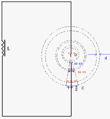 如圖12,A、B、C等處的光源發出的光線,在通過“球狀閃電”時,都在“球狀閃電”中的“光子流體能量負壓”的作用下,被“吸入”“留住”作“圓周運動”,而不能穿過“球狀閃電”,光源對面的觀察者將不能看到這個光源發出的光線——呈現“黑洞效應”。
