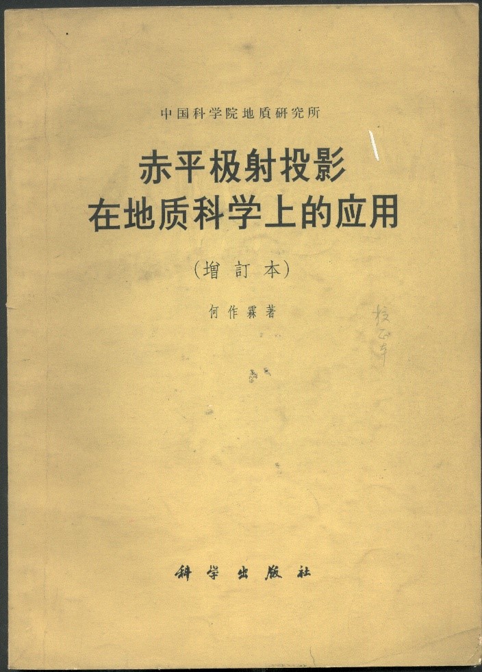 “極射赤平投影”不僅是研究巖組學的重要工具,而且也是地質構造研究方面的方法典范,在地質學上廣泛應用。何作霖是我國第一個對該方法在地質科學上應用做綜合闡述者。他集多年的理論研究、科研實踐及各國零散資料撰寫出版了《赤平極射投影在地質科學中的應用》(科學出版社,1958)一書,深受巖礦工作者喜歡,后又多次再版。這是世界上第一部這方面的專著,也是中國構造地質學和巖石礦物學工作者長期必讀的重要工具書。