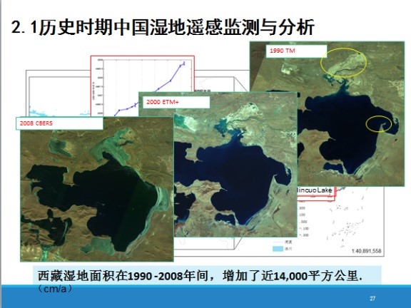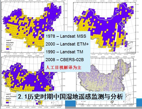 歷史時期中國濕地監(jiān)測與變化分析,因為濕地復雜性太難了,但是當時已經(jīng)具備了所有遙感數(shù)據(jù),70年代的MSS,能全部覆蓋一次衛(wèi)星數(shù)據(jù)的,這是1978年MSS數(shù)據(jù),到了2000年,1990年,到了2008年我們用中巴衛(wèi)星數(shù)據(jù)做了研究,每期我們都出了大量的數(shù)據(jù),我們只想了解一下我們國家的濕地情況,就用最笨的方法人工目視解譯,做了大概3年時間,前后投入60、70個人做完這項工作,基本上對咱們國家濕地現(xiàn)狀有一個初步的了解。