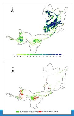 季節(jié)性沼澤減少直接導致珍稀鳥類和魚類食物來源的減少,造成棲息地環(huán)境質(zhì)量下降甚至破壞;季節(jié)性沼澤的喪失和退化將使洞庭湖濕地的生物多樣性降低。最顯著的是西洞庭湖和南洞庭湖區(qū)林地面積的快速增加,主要由沼澤轉(zhuǎn)化而來,如圖,其中永久性沼澤轉(zhuǎn)化為林地共14800 公頃,由季節(jié)性沼澤轉(zhuǎn)化為林地為7900公頃 。