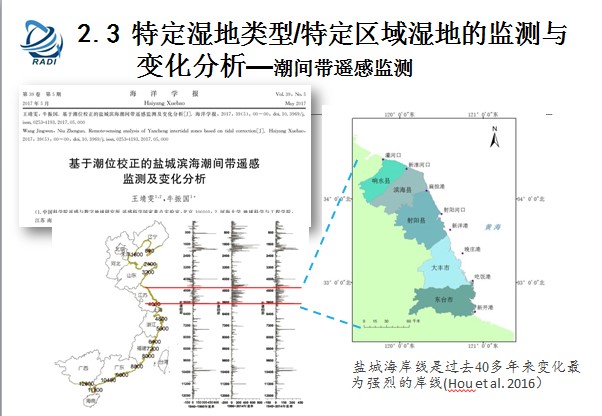特定濕地類型的監(jiān)測與變化分析,為什么最近在做特定類型呢?我們發(fā)現(xiàn)監(jiān)測濕地變化呢,從無到有,從原來不了解,研究了之后發(fā)現(xiàn)我們很多數(shù)據(jù)不足,包括其中很多類型沒有監(jiān)測到,包括水田用其他的方法補充進去了。因為海洋漲潮的時候衛(wèi)星每天時間大概早上5點過境,但是沒法監(jiān)測潮間帶,所以我們對潮間帶做了監(jiān)測。