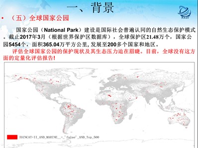 保護區(qū)評價,目前開展的是全球國家公園保護現(xiàn)狀和生態(tài)壓力評估正在做工作,首先為什么要干這項工作,加強國家公園保護狀態(tài)和生態(tài)壓力定量化評估,有助于人類了解地球上最美麗的生態(tài)環(huán)境資源的性質(zhì)和數(shù)量以及人類自身對這些資源產(chǎn)生了什么的壓力,有助于提高人類關于自然保護與持續(xù)發(fā)展的科學認識和面對生態(tài)環(huán)境退化的應對能力。有助于提升我國在世界上生態(tài)環(huán)境保護的地位和話語權。有助于提升我國在全球國家公園建設、生態(tài)安全維護和“一帶一路”戰(zhàn)略布局都具有重要的參考價值。通過研究世界上最好的范例,對中國國家公園體制改革試點、中國國家公園建設彎道超車和中國保護區(qū)事業(yè)健康發(fā)展均具有一定的借鑒意義。