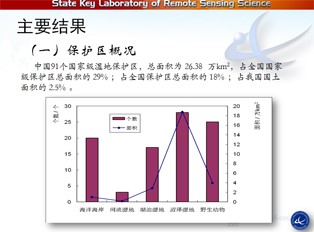 這是保護區(qū)的效果,在我結論里面按個數(shù)來看保護好的19個,保護不太好是44個,所占比例不太好將近一半,但是從面積來看非常不樂觀79%不太好,原因在什么地方呢?后面我們也分析了,有一個全國最大的保護區(qū),一個保護區(qū)占超過15萬平方公里,主要是這一個保護區(qū)造成比例相差大一點。