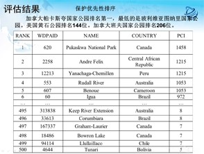 如圖所示,最后一排PCI的值最高達到1000多,最少只有5,加拿大帕卡斯夸國家公園排名第一,最低的是玻利維亞圖納里國家公園。美國黃石公園排名144位。加拿大班夫國家公園排名206位。