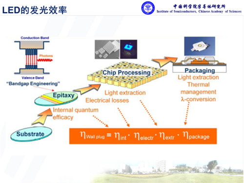 氮化鎵是直接帶隙的半導體材料,在光電應用方面具有獨特優勢。基于氮化鎵的HB-LED對于通用照明來說,其核心問題是發光效率。其中外量子效率主要取決于三個層面的因素,內量子效率、光提取效率,還有封裝方面的熒光轉化等效率,而且每個環節都息息相關。