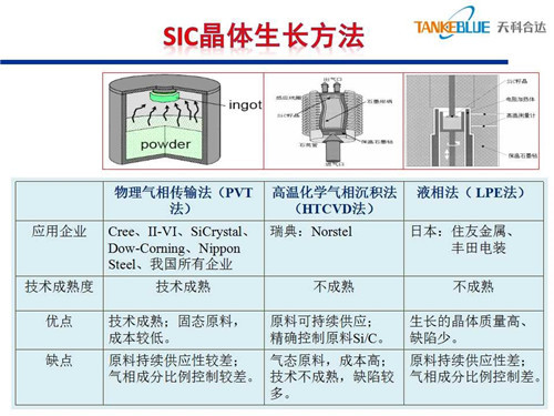 碳化硅襯底的生長方法有三種:一是物理氣相傳輸法,該技術相對成熟,性價比高;二是高溫化學氣相沉積法,優點是原料可持續供應,可精確控制原料中的碳硅比;三是液相法,尚處于研究階段。