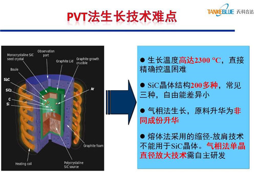 PVT法生長碳化硅存在以下技術難點,一是晶體生長溫度高達2300℃,直接精確控溫困難;二是很難獲得單一的碳化硅晶體結構;三是生長時原料易升華為非同成份其他物質;四是熔體法采用的縮徑-放肩技術不適用于氣相法碳化硅晶體生長,氣相法單晶直徑放大技術需自主研發。