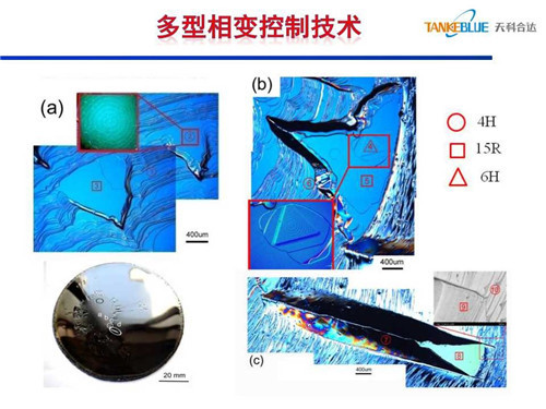 碳化硅晶體生長時如果臺階過寬,晶型沿 [0001] 方向的排列信息反應不出來,會在臺階上自發成核,發生晶型轉變。研究發現,當晶體表面不光滑、不平整時,易發生多型相變,4H會發生6H和15R相變。另一方面晶型轉變與生長室氣氛相關,通過控制生長室氣氛解決了多型相變技術。