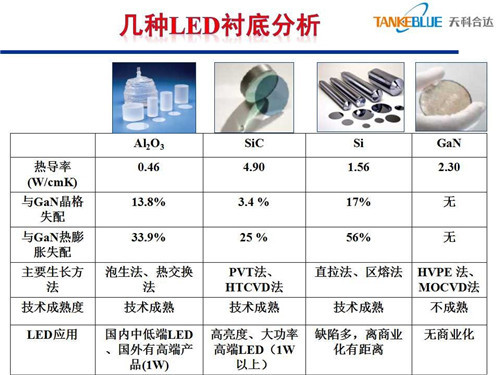 但是在這里面我們今天講的主要是藍寶石、碳化硅,剛才在講的時候我思考幾個問題,這幾個材料在發光效率上藍寶石可以做到150lm/W,碳化硅可以做到200lm/W,在發光效率上確實體現差異。在物理基礎參數上體現了差異,比如說跟氮化鎵外延,從晶格匹配上,碳化硅上長氮化鎵確實好一些,藍寶石失配大一些,直接影響外延的質量。另外導電性、熱導率也是有差異的。