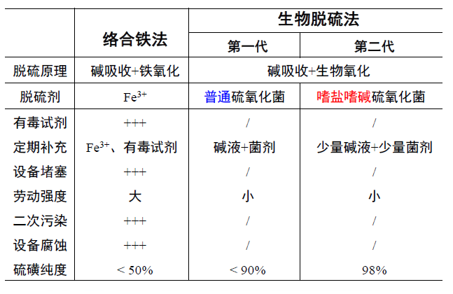 經過中試連續運行我們發現嗜鹽嗜堿硫氧化脫硫體系相比傳統絡合鐵法具有明顯的優勢:極端微生物可耐受的環境優勢更為突出,僅需定期補充堿液及少量菌劑就可保證整個系統連續運轉,勞動強度小,且系統回收單質硫磺的純度高達98%。更多內容見下表。