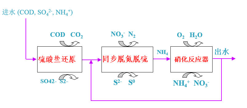 同步除碳脫氮脫硫體系:由硫酸鹽還原、碳氮硫同步脫除和硝化三個階段組成(圖2-6)。