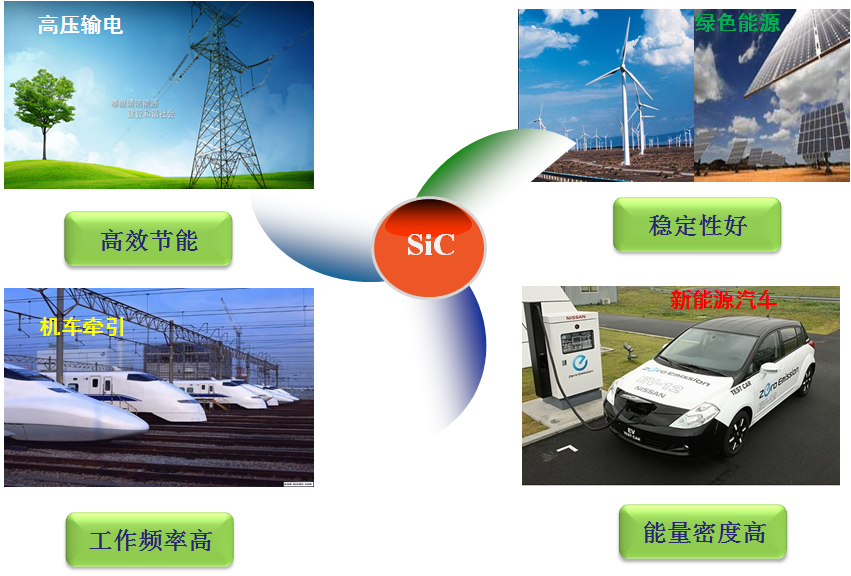 以碳化硅(SiC)為代表的寬禁帶半導(dǎo)體大功率器件是目前在電力電子領(lǐng)域發(fā)展最快的新型半導(dǎo)體功率器件。碳化硅器件在高壓直流輸電,以及綠色能源,機車牽引高鐵,新能源汽車方面有很好的應(yīng)用潛力。應(yīng)用于高壓直流輸電領(lǐng)域,具有高效節(jié)能的特點。在綠色能源方面,碳化硅本身的可靠性和穩(wěn)定性比較好,適合在苛刻的環(huán)境里面使用。在機車牽引領(lǐng)域,用碳化硅MOSFET取代硅IGBT,可提高工作頻率。碳化硅也非常適合應(yīng)用于電動汽車以及混動汽車,因為用它做出來的PCU的體積小,效率高,可提高電動汽車的能量利用效率。