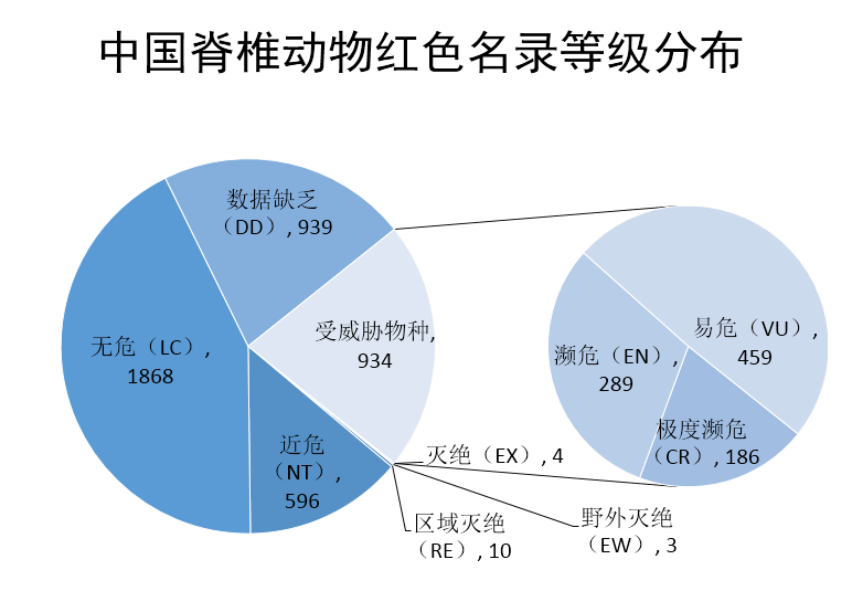 2015年完成的《中國生物多樣性紅色名錄-脊椎動物卷》,共評估了中國4357種脊椎動物,包括673種哺乳類,1372種鳥類,461種爬行類,408種兩棲類,1443種淡水魚類。其中939種數據缺乏,1868種無危,596種近危,受威脅的物種共934種。在934種受威脅物種當中,易危459種,瀕危289種,極度瀕危186種。受威脅的原因分析中,過度利用、生境喪失和人類干擾是最主要的威脅因子。