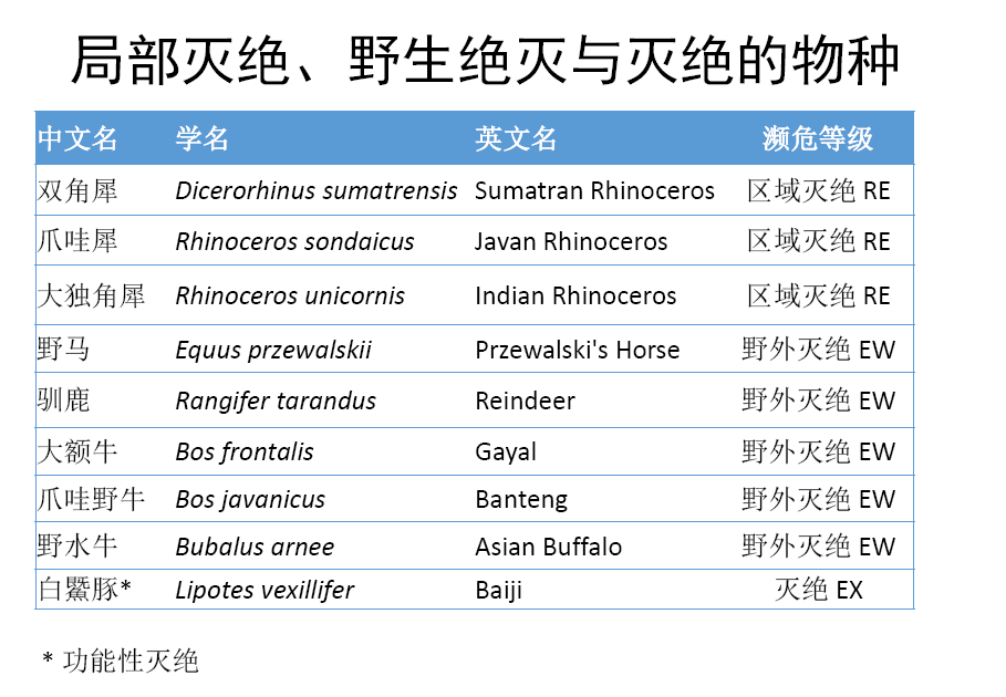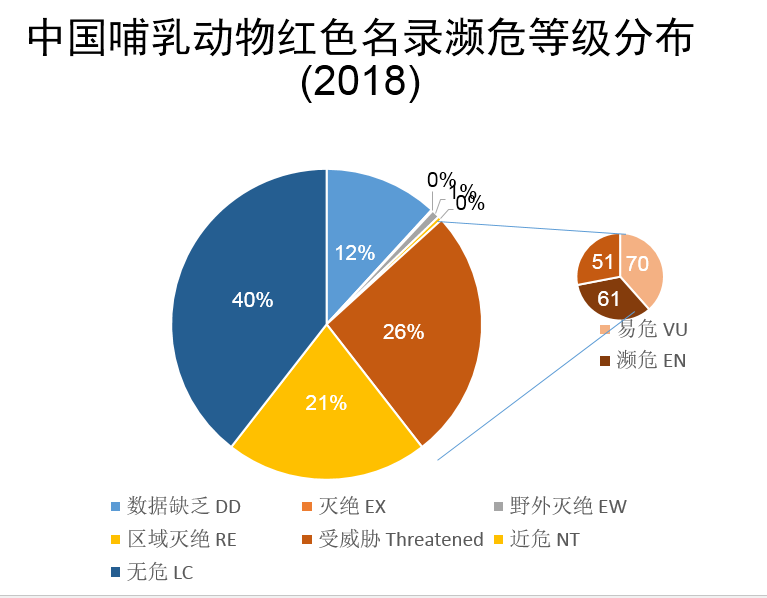 此外,我們對中國哺乳動物多樣性進行編目,分別于2015年和2017年完成了第一版和第二版,第一版中,我們收錄了673種哺乳動物,第二版中我們刪除了一些不存在的物種如倭巖羊,并增添了一些物種,主要是分布在藏南的一些物種,共收錄了693種哺乳動物,使得我國的哺乳動物總數位列全球首位。2015年發布《中國生物多樣性紅色名錄-脊椎動物卷》后,2018年又對該紅色名錄等級進行了更新,哺乳動物的情況來看,最新的評估結果中,受威脅的物種占26%、近危21%,無危40%,數據缺乏12%,其中有多個物種已經區域滅絕、野外滅絕或功能性滅絕。部分中國特有的哺乳動物,中國生物多樣性紅色名錄和IUCN紅色名錄的評估結果,由于評估信息的不同,結果也有所不同,如白鱀豚、長江江豚等;還有一些哺乳動物由于并非中國特有,所以中國生物多樣性紅色名錄和IUCN紅色名錄評估等級有所不同,如野馬、賽加羚羊、麋鹿、蒙原羚、河貍等。