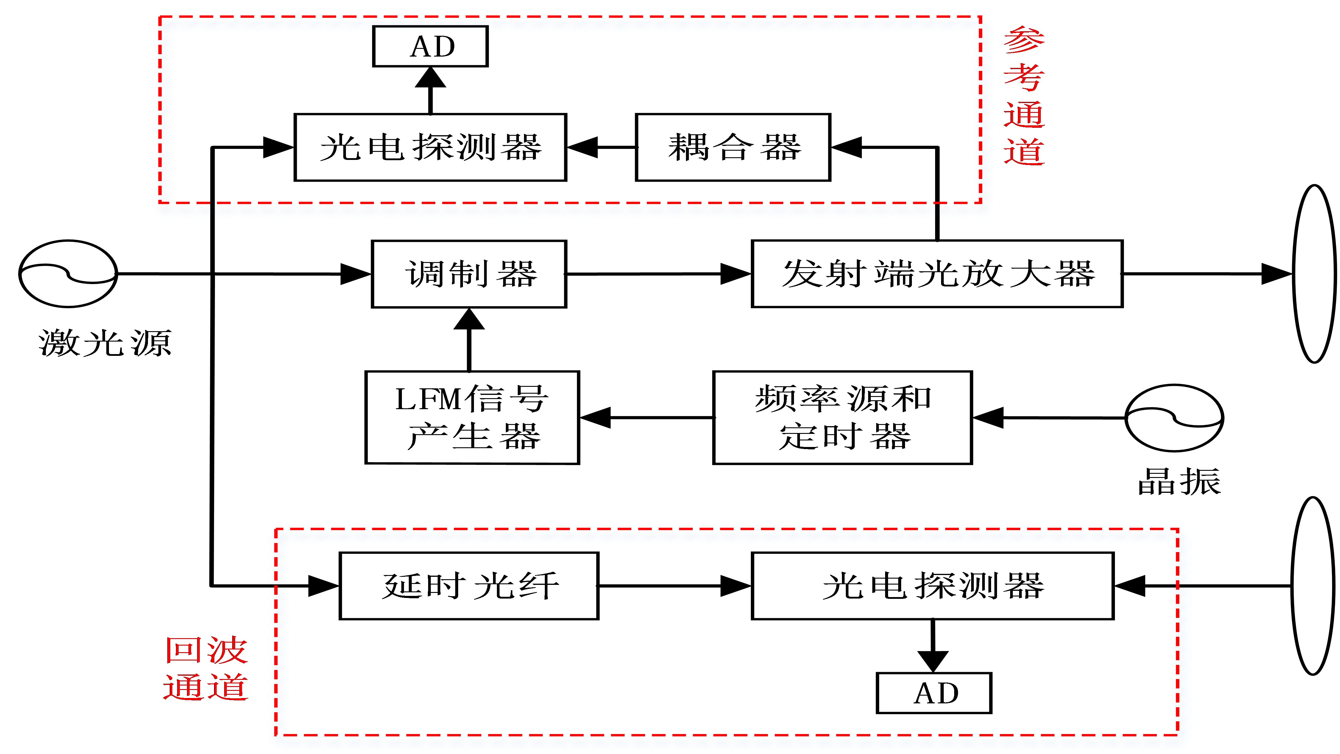 設置發射信號參考通道對其非線性失真相位實施定標校正,以及通過本振延時光纖實現信號相干性保持方法如圖2所示。