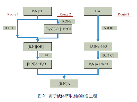 近年來我們開展離子液體萃取劑的研究,例如[A336 ] [ P507]。該結構簡單的理解就是將P507進行有機錢鹽的皂化,有機錢鹽常采用Aliquat336,國內商品名稱為N263。[ A336 ] [ P507]的結構如圖1所示,是一種典型的離子液體,所以我們稱之為離子液體萃取劑。