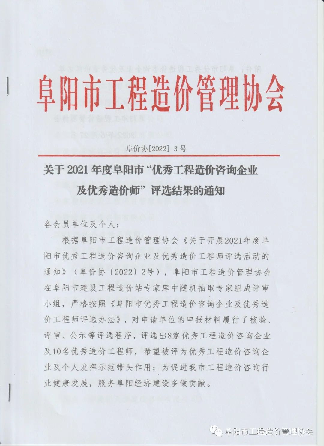 關(guān)于2021年度阜陽市“優(yōu)秀工程造價(jià)咨詢企業(yè)及優(yōu)秀造價(jià)師”評選結(jié)果的通知