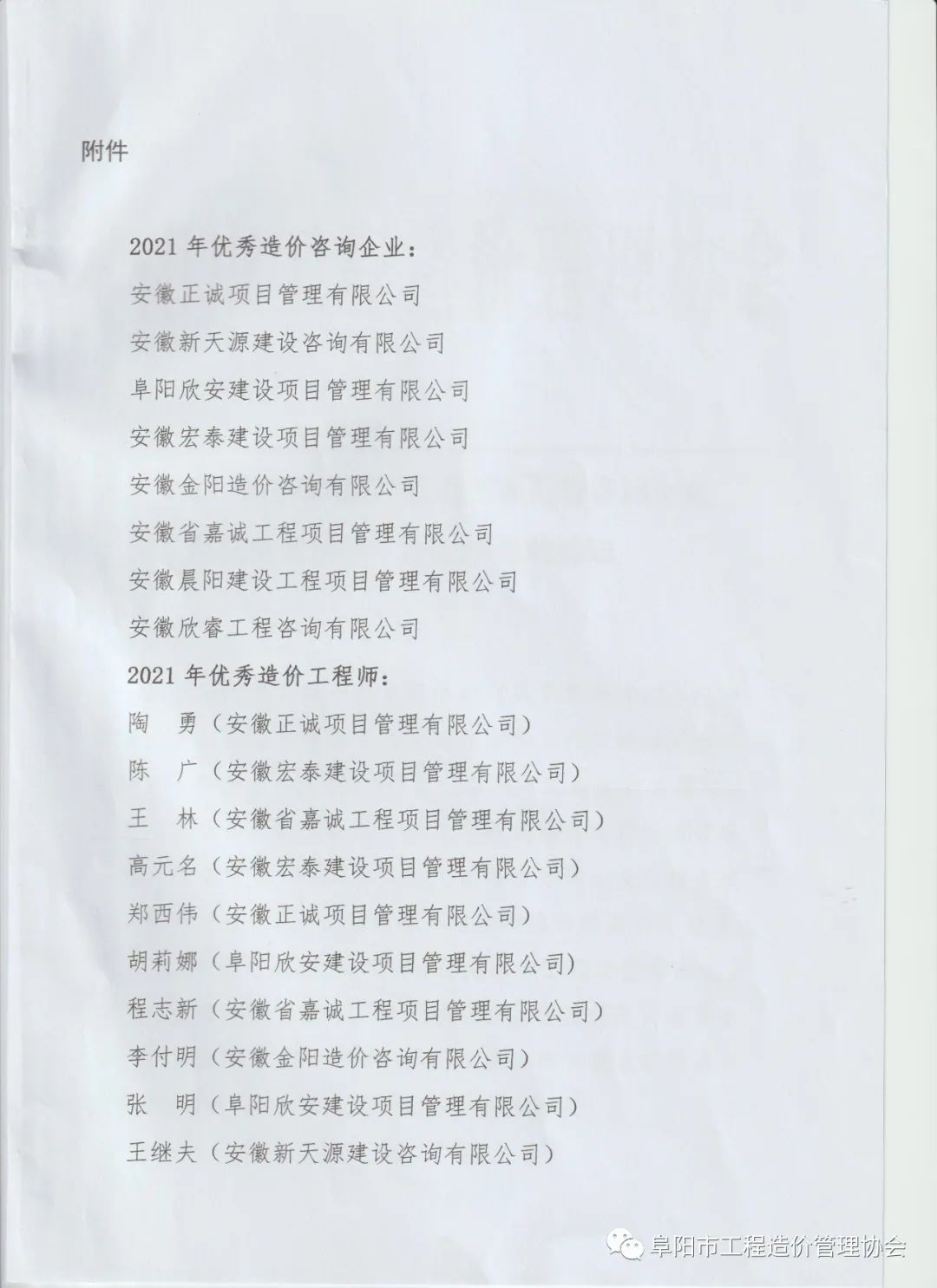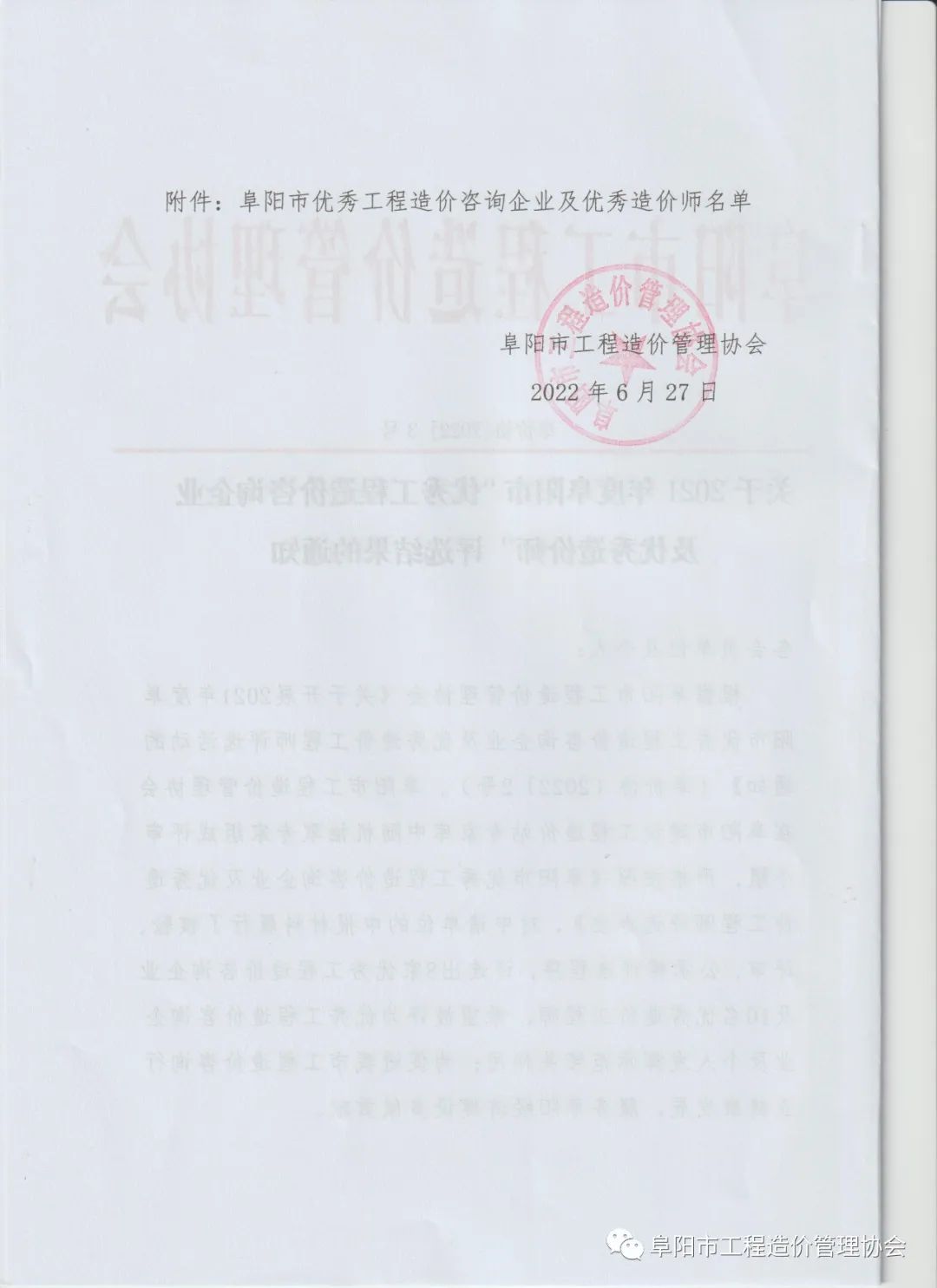 - 關(guān)于2021年度阜陽市“優(yōu)秀工程造價(jià)咨詢企業(yè)及優(yōu)秀造價(jià)師”評選結(jié)果的通知